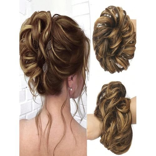 1PCS M Hair Bun Hair Scrunchies Extension Curly Wavy M Synthetic Chignon For Women(Brown Mixed Blonde)
