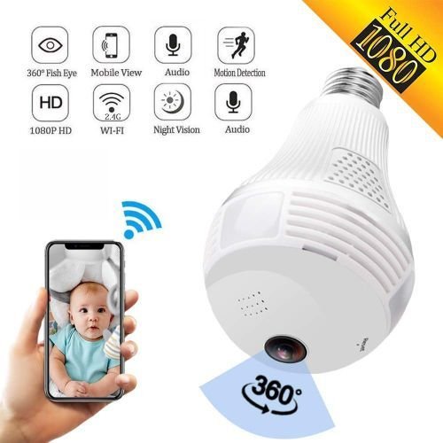 Product details360 Degree angle of view, Zero blind spots:? The 360 degree fish eye lens in this light camera gives you a super wide angle of view with no blind spot. You can therefore see everything going on at any given time, making this bulb camera ideal for keeping your property surveilled all around the clock1080P?Full HD image Recording: Record clear and crisp 1080P images and videos from our hidden camera. The Images are clear enough to show even the smallest detail. The recordings are stored in the in-built SD card (up to 64GB not included) or can be streamed live to your phoneMotion Detection?Function / Push?Alerts: Our bulb camera gives you the easiest way of keeping you in the know even when you are not home. Using the advanced method of image analysis to detect the movement of objects, an in-built motion detection feature detects movements and sends you a push alert to your phone allowing you to instantly live stream footage from the light bulb hidden cameraFast, Easy and Simple WiFi Connectivity: Connecting this panoramic camera to your phone via a wifi network is very simple and straightforward. Bulb camera also has an easy to use Graphical Interface that lets you perform actions remotely. You can baby monitor camera in real-time, playback video, and activate alarm with absolute easeNo Assembly or Power adapters Required: Unlike other types of hidden cameras, our light camera requires zero assembly or power adapters. Simply insert it into a standard bulb holder and connect to it via wi-fi. That?s all there is to it. Click ?Add to Cart? nowNot Only A Lightbulb: Unlike ordinary light bulbs, there is no case where the tungsten wire is melted. It is not only a surveillance camera but also a light bulb for illumination. You can control when to turn it on or off by its remote plan