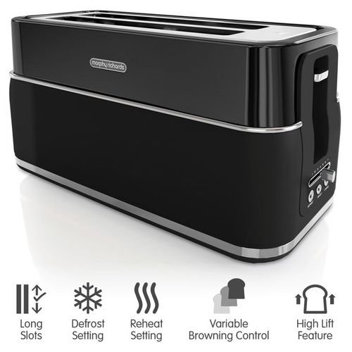 Specification4-slice / 2-long slot toasterVariable browning controlVariable width slotsReheat functionHigh-lift functionDefrost settingThe Morphy Richards signature 4 slice ,2 long slot toaster is ultra-stylish in on-trend patterned plastic with a premium gloss finish. Let signature make a sweeping statement in your kitchen.Easy to operate with variable browning control, the signature 4 slice toaster gives you perfect toast, to your taste, every time. It comes complete with handy defrost and re-heat settings, plus the long slots ensures that cleaning up is easy.