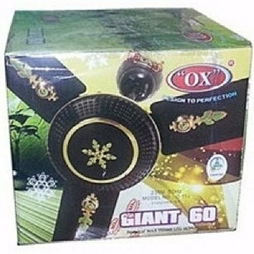 The OX giant 60 inch Ceiling Fan goes at high speed for strong breeze and has a five-speed regulator with minimum 60 percent regulation. With a 60 inch sweep, it has a permanently lubricated double ball bearing assembly for a noise-free and long-lasting operation. • Details: Elegance Ceiling Fan • Colour: white • Attractive blade trims and decorative cup Features Number of blades: 3 Supply: a.c., Single Phase Volts V: – Voltage Range V – Rated Voltage Frequency? Sweep in MM: Current drawn in (A): ±10% Amp Max speed (RPM): RPM Power consumption in (W): W Air delivery (M3/Minute):? M3/Minute Phase: Single Phase. The OX giant 60 inch Ceiling Fan goes at high speed for strong breeze and has a five-speed regulator with minimum 60 percent regulation. With a 60 -inch sweep, it has a permanently lubricated double ball bearing assembly for a noise-free and long-lasting operation. • Details: Elegance Ceiling Fan • Colour:? • Attractive blade trims and decorative cup Features Number of blades: 3 Supply: a.c., Single Phase Volts V: 220-240 V – Voltage Range 230v Rated Voltage Frequency Hz:? Sweep in MM: 1400 mm Current drawn in (A):Amp Max speed (RPM):RPM Power consumption in (W):W Air M3/Minute Phase: Single Phase