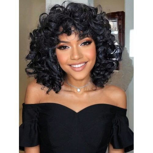 Short Curly Wigs For Black Women Glueless Big Curly Wig With Bangs For Daily Use Bouncy Fluffy Curly Afro Wig For African American Women Afro Wigs For Women 10 Inch Black