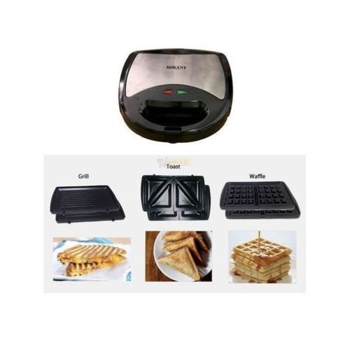The Sokany 3 in 1 Snack Maker is a highly multi-functional appliance, offering the choice of three cooking techniques to make your choice of snacks as varied and convenient as possible.The?sandwich press plates?make toasted sandwiches a breeze, simply put your choice of sliced bread and filling inside the moulds and lock the lid in place. The snack maker will cut, seal and toast your sandwich in minutes, making perfect toasties every time!The?grill plates?are the most versatile of the accessories included with the snack maker. You can use them to press larger sandwiches like paninis or foccacias; or even to grill meats and vegetables like steaks, burgers, tomatoes or peppers.If you want to indulge your sweet tooth, the snack maker is perfect for that too! With its?Waffle Iron plates?you can make delicious Belgian style waffles extremely quickly. It’s as simple as pouring your mixture into the moulds and closing the lid! You can then create your waffles with your favourite toppings!All three interchangeable cooking plates are coated with a non-stick coating, so cleaning is as simple as the cooking. Simply wipe clean with hot water.